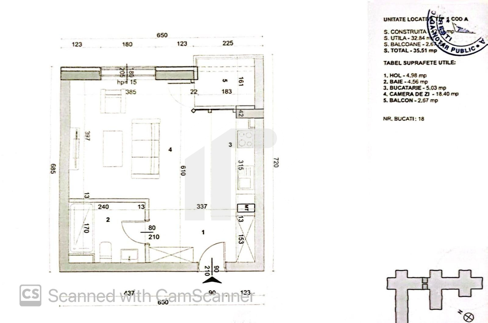Studioul are o suprafata utila totala de 35.5mp dintre care 2.8mp de balcon. Orientarea este catre N-E, iar vederea este libera, catre lac.